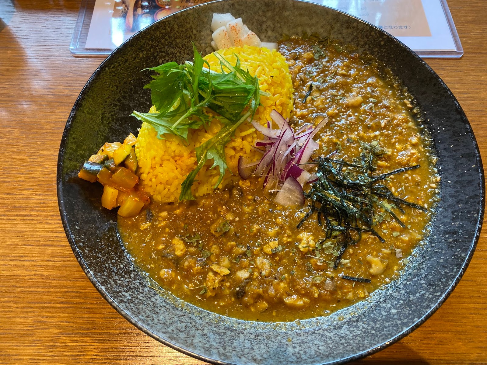 バジルとカシューナッツのチキンキーマカリー 900円。落ち着いた雰囲気で内装もおしゃれなお店でした。見た目が綺麗で異国感あふれるカレーでした。